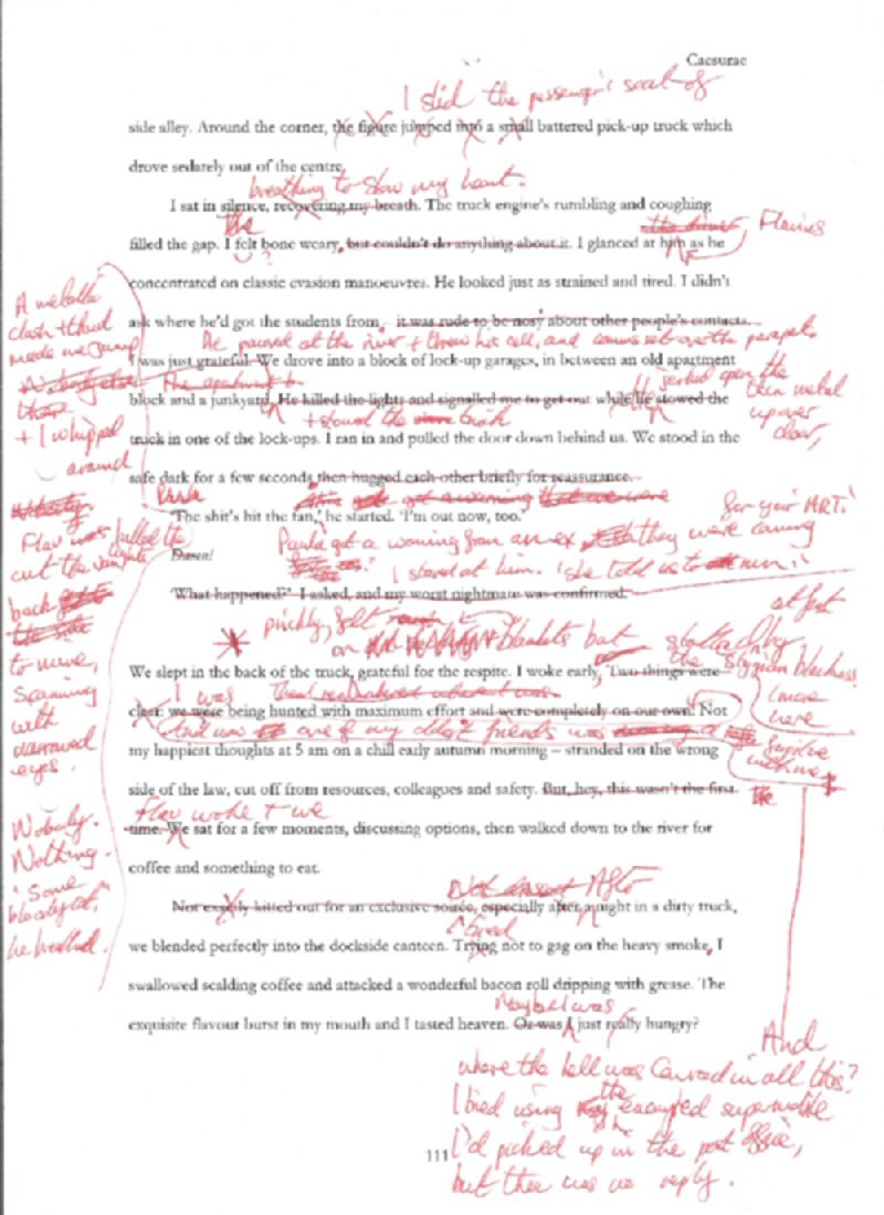 When I open it again, I carry out the first edit with my red pen. Then off it goes to an external assessor. He/she will look for plot holes, character failings, extraneous or awkward scenes and inconsistent dialogue but more than anything for cohesiveness and whether the story grips. Without page-turning quality, the book won’t deliver a good read and that’s the writer’s duty.