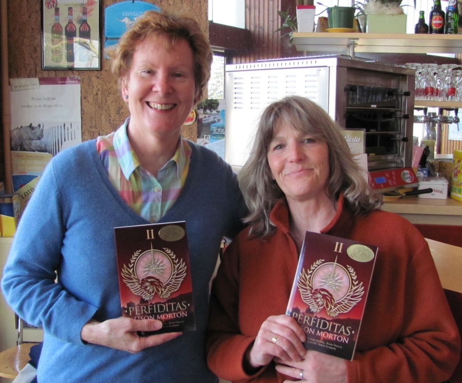 The day after I heard PERFIDITAS had been awarded a B.R.A.G.Medallion®, I shared the news with Jan Smith our local paperback vendor. Here we are in the Bar de la Paix where our local book club meets.