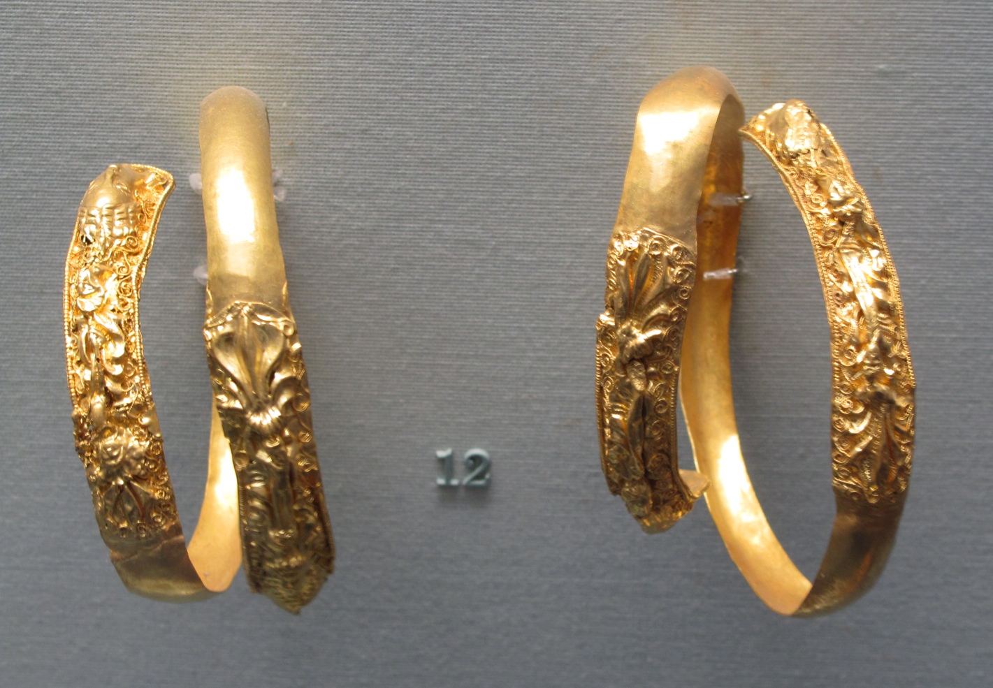 Gold Etruscan bracelets with embossed female heads.palmettes and the figure of Eros 300-200BC
