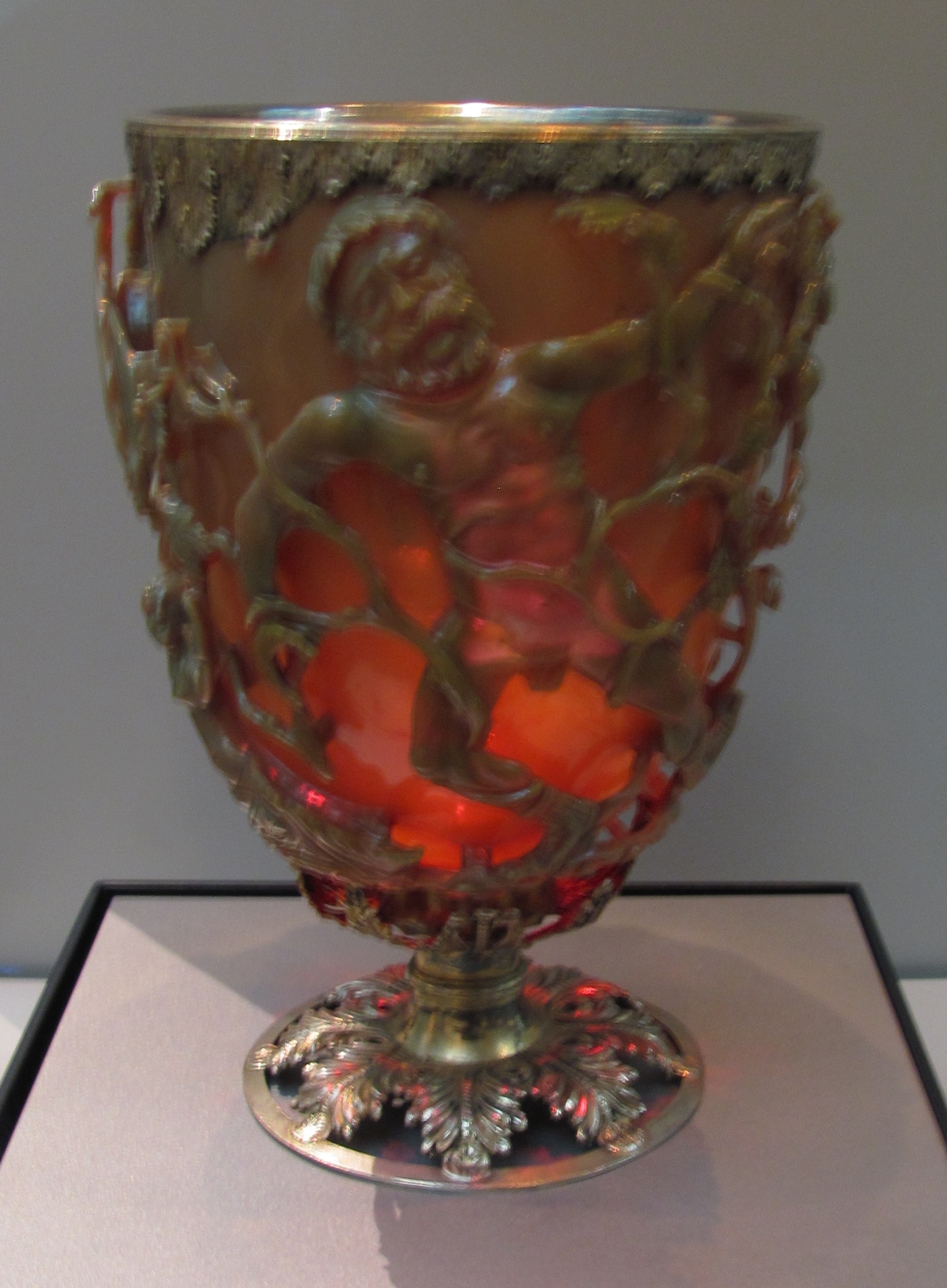 The Lycurgus Cup, Late Roman Empire, AD 300s. This very rare cage cup’s glass contains tiny amounts of gold abad silver which cause it to turn from opaque green to translucent red when light is shone through it. The gilded silver rim and foot were probably added in the 1700s.