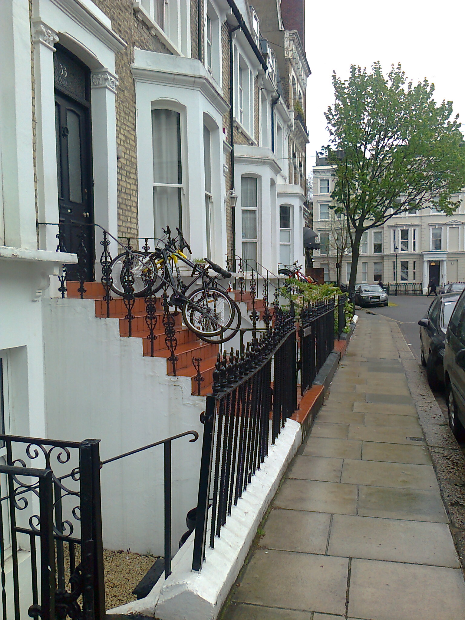 Out into the rain this morning on my way to the British Museum to see the Vikings, I walked down Earls Court Gardens and spotted sets of bicycles chained artistically to the railings. I guess there’s nowhere else to store them.