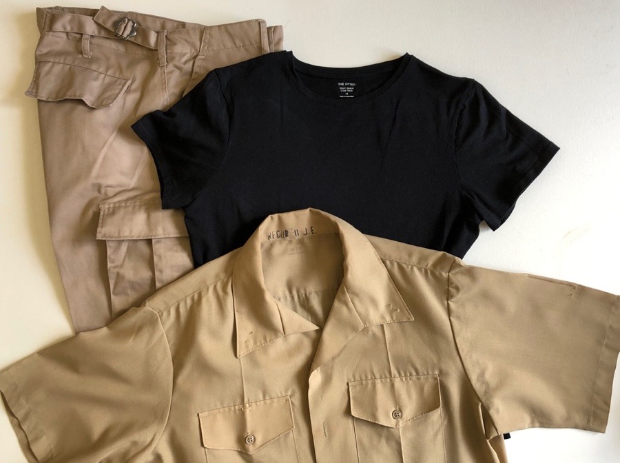 The shirt and trousers are very slightly different shades of beige – I had no idea beige varied so much! But with a black belt separating them, it was scarcely noticeable. The BDU (Battle Dress Uniform) trousers had drawstrings at the bottom leg edges hem to form cuffs to go over para boots, but out came my needle and some beige thread to transform them into standard hems.