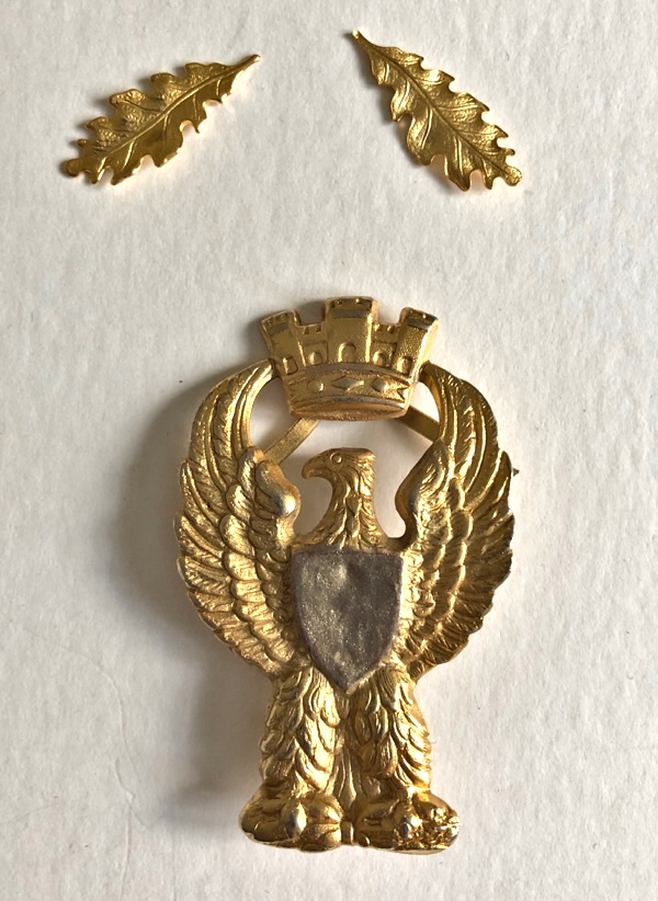 I had been on the Internet, Etsy to be precise. There were loads of double headed crowned eagles, but few single ones. At last I tracked one down to Bulgaria for 4.50 euros! A central shield was missing, probably an enamel plaque, but that was fixable. Several layers of mixed gold nail polish later to cover the grey metal and the empty space had disappeared