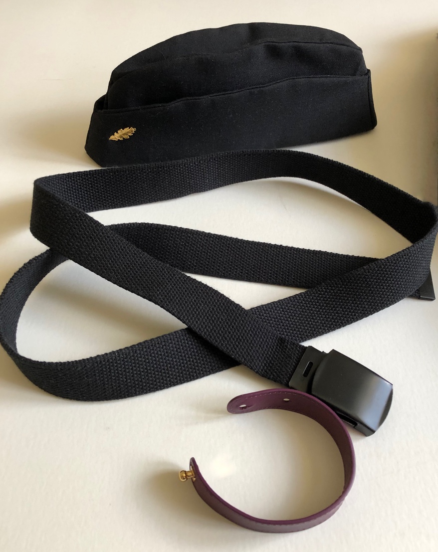 Then I hit a real obstacle – the cap. Apart from Nazi SS ones (which would have given me the creeps to wear), I couldn’t find black anywhere; neither could Laurence. Time pressed. Back on the fabulous Internet and by accident I found a sewing pattern for a side cap on Pinterest. Burrowing in my material box, I hoicked out some black trouser material, and found some spare plastic flyscreen netting for stiffener. (Don’t laugh!) I have a large-ish head (no impolite comments, please) so I expanded the pattern, cut out the pieces and sewed it. It was a demon with the double sides, but I got there. And yes, I did sew my name inside. Old habits, like old soldiers, die hard.
